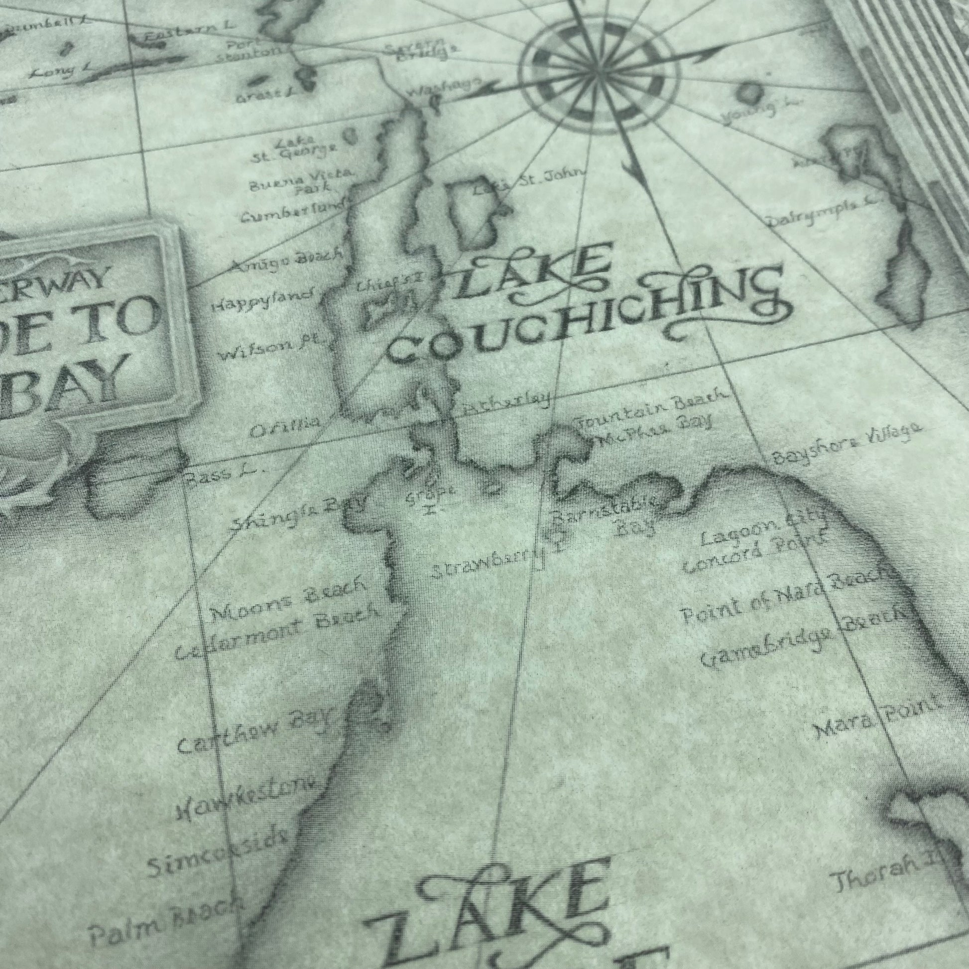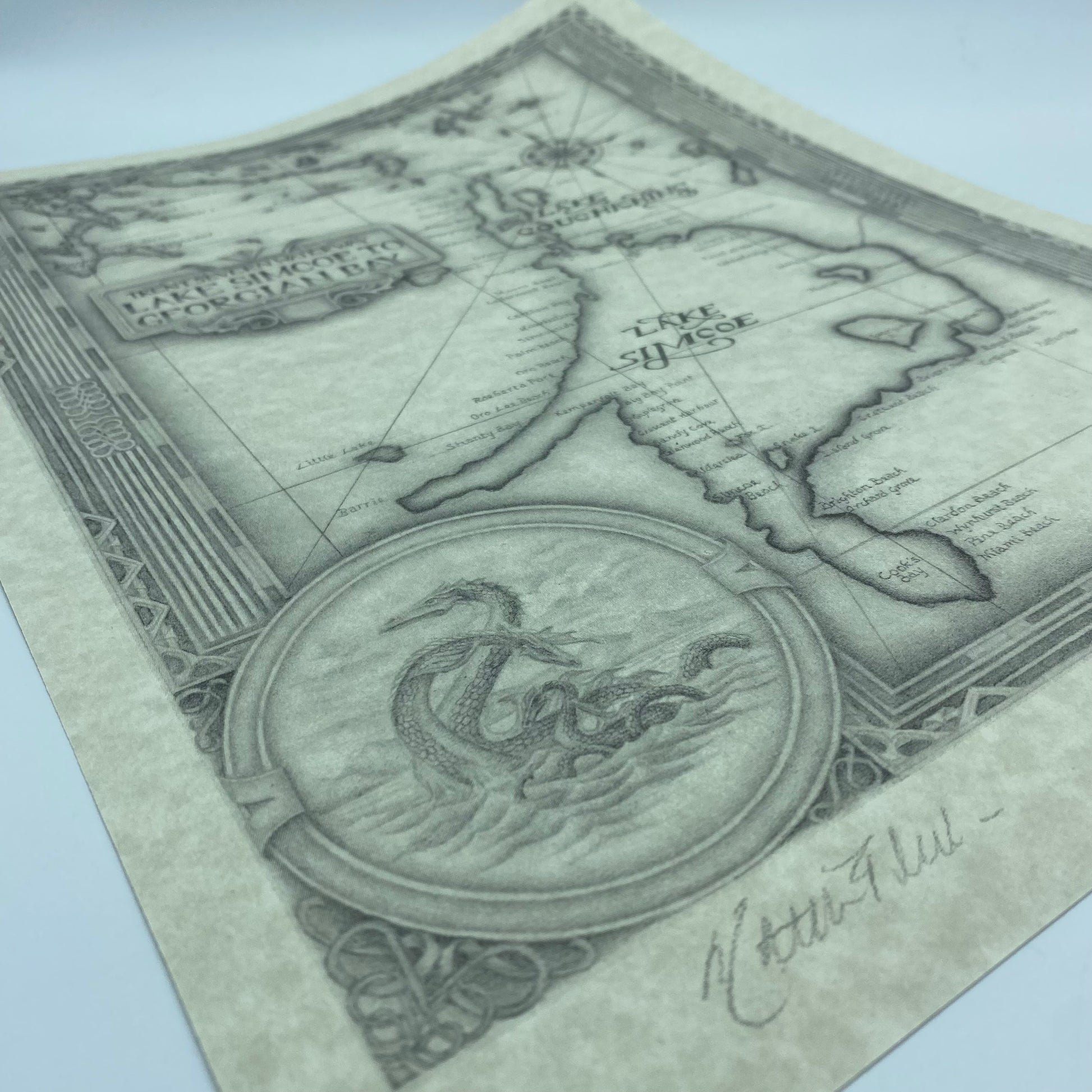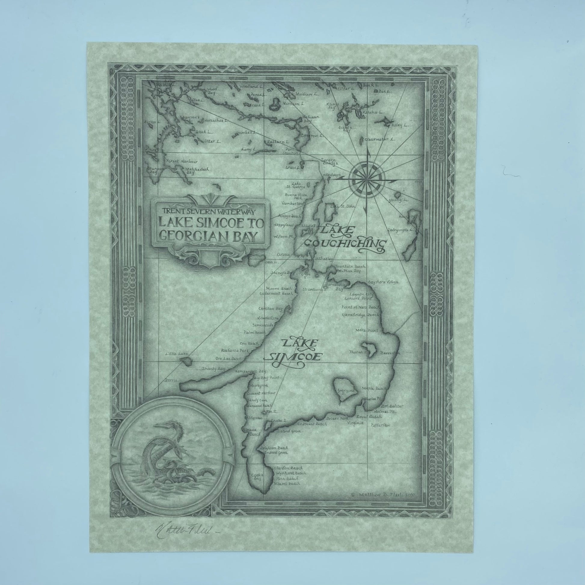 Matthew's background in geography is evident in his series of hand drawn maps rendered in the style of antique I7th century maps. Inspired by his academic studies of antique maps of the Caribbean, Matthew rendered a map of Kahshe Lake where his family cottages. Prints of this map adorned with frigates and sea monsters were so popular amongst other Kahshe Lake residents that Matthew has gone on to produce a series of maps of other popular cottage destinations. The tedious nature of hand drawing a map decorated with intricate borders and mythical monsters typically limits Matthew to one creation a year, of which reproductions are printed. The reproductions of his maps all bear his signature and are printed on a parchment style of paper to embellish the old world feel.